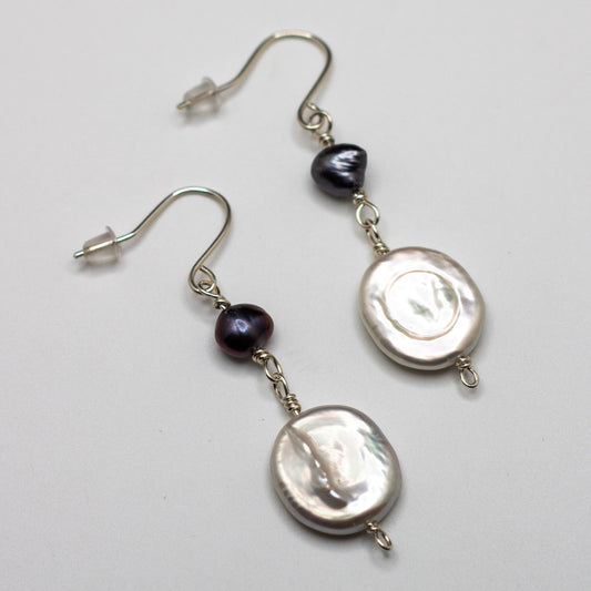 Coin & Black Freshwater Pearl Earrings (Sterling Silver)