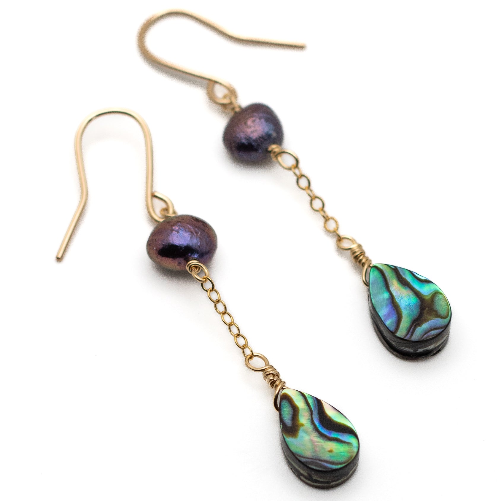 Rich in color and natural beauty, these 14K gold filled earrings feature vibrant abalone teardrops suspended from delicate gold chain, accented by luminous black freshwater pearls. The iridescent abalone shimmers with shades of teal, blue, and violet, creating a stunning contrast against the deep luster of the pearls.