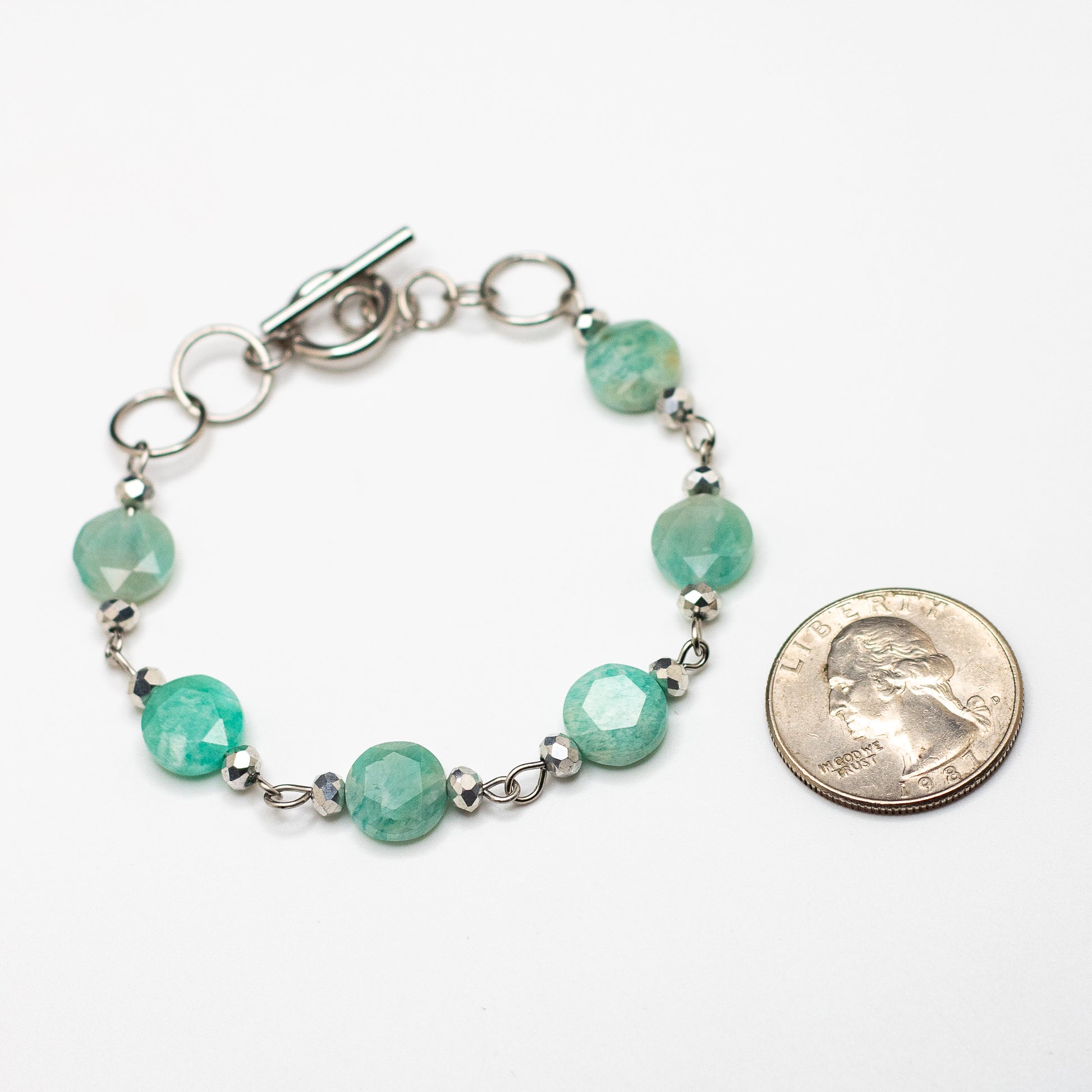 Soothing and balanced, this one-of-a-kind bracelet features 10mm faceted amazonite coin beads in soft shades of aqua, teal, and sandy beige. Often referred to as the Stone of Courage and Truth, amazonite is believed to promote harmony, open communication, and inner peace—making it as meaningful as it is beautiful.