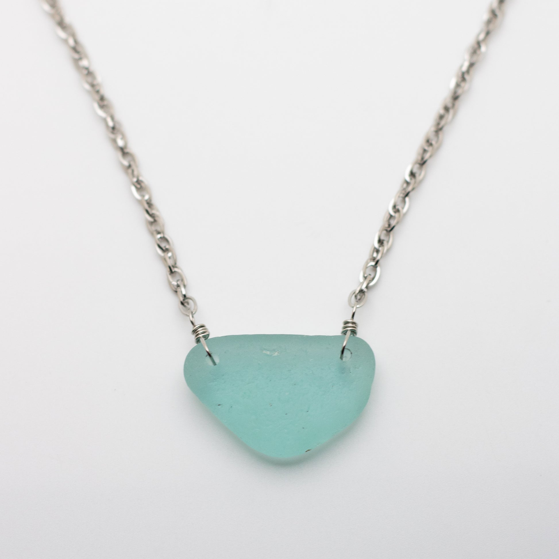Radiant and refreshing, this Aqua Beach Glass Necklace captures the luminous beauty of Lake Erie’s shoreline. The centerpiece features a genuine aqua beach glass pendant, approximately 1” in width, hand-collected and shaped by the natural forces of water, wind, and time. Its soft glow and gentle translucence reflect the light beautifully, evoking the peaceful shimmer of sunlit waves.