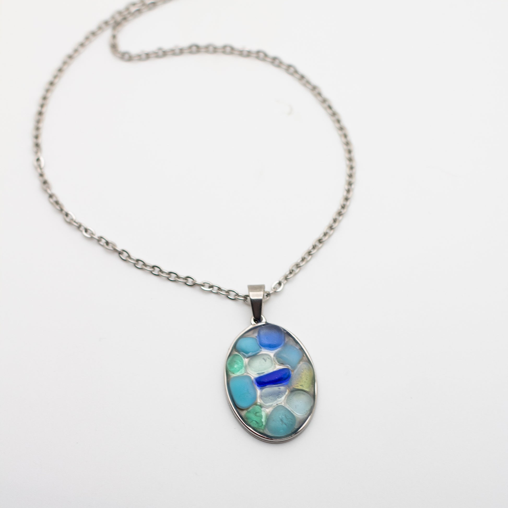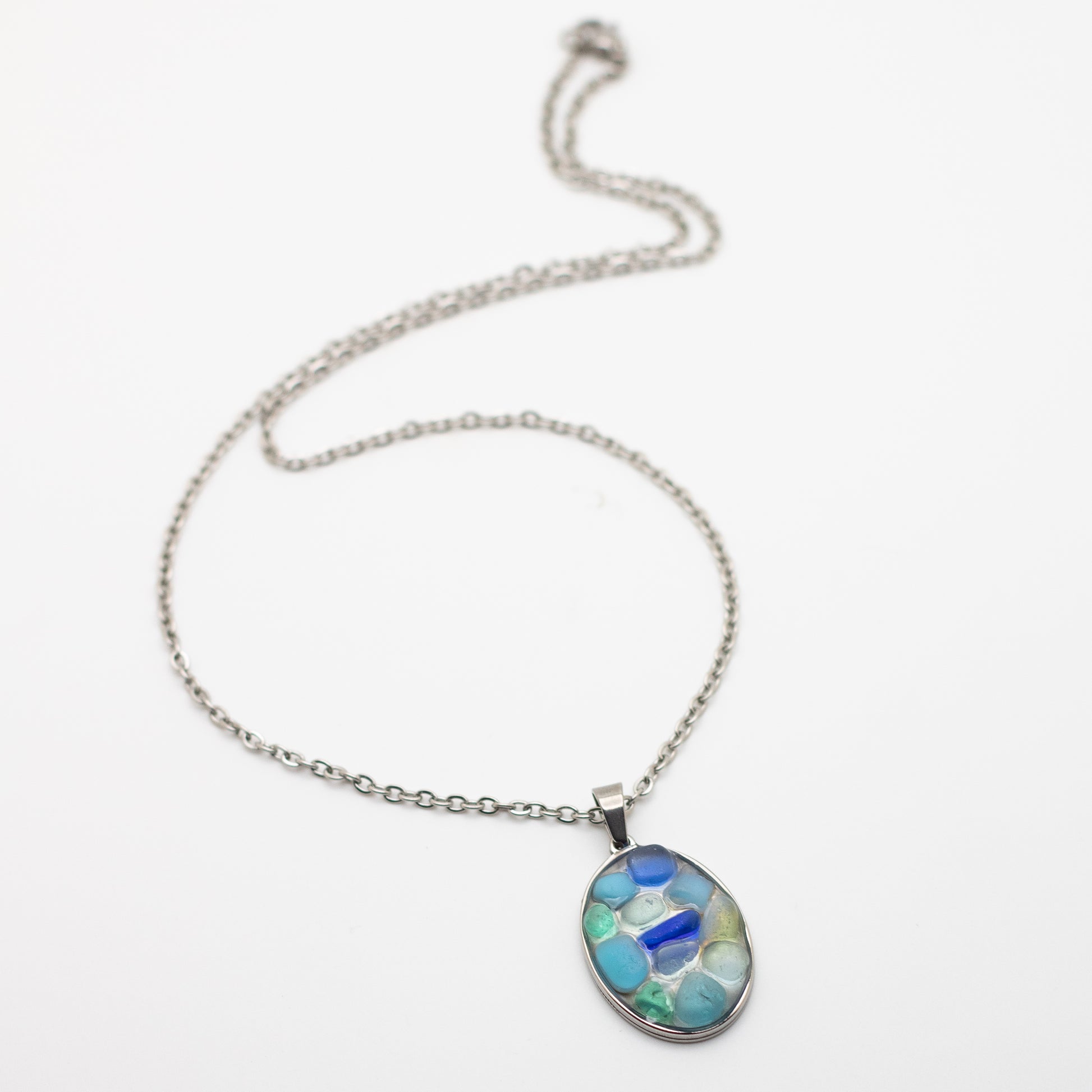 Inspired by the ever-changing colors of the sea, this Blue Hue Mosaic Beach Glass Necklace captures the tranquil beauty of Nova Scotia’s coastline. Each piece features a handcrafted mosaic of genuine aqua, seafoam, opaque blue, clear, cornflower, and cobalt beach glass, all collected from the shores of Nova Scotia and set in resin within an oval pendant to preserve their natural, ocean-tumbled texture and luminous hues. Every necklace is a one-of-a-kind reflection of the shoreline—where sunlight meets the waves in a medley of soft blues and shimmering clarity.
