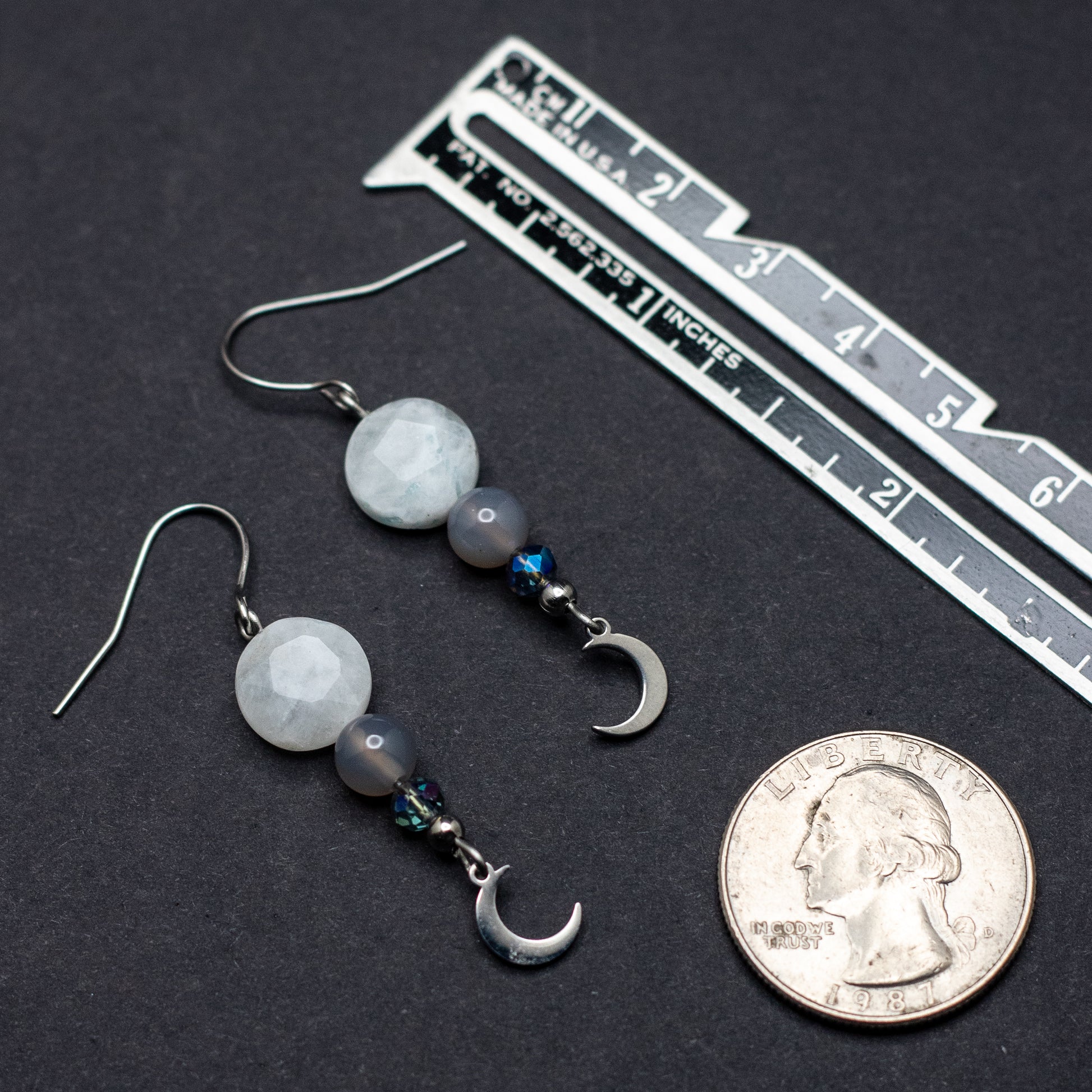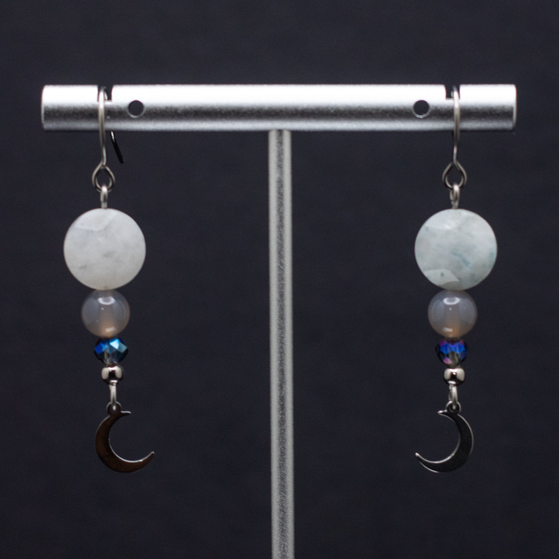 Blue Moonstone, Gray Agate & Crescent Moon Earrings