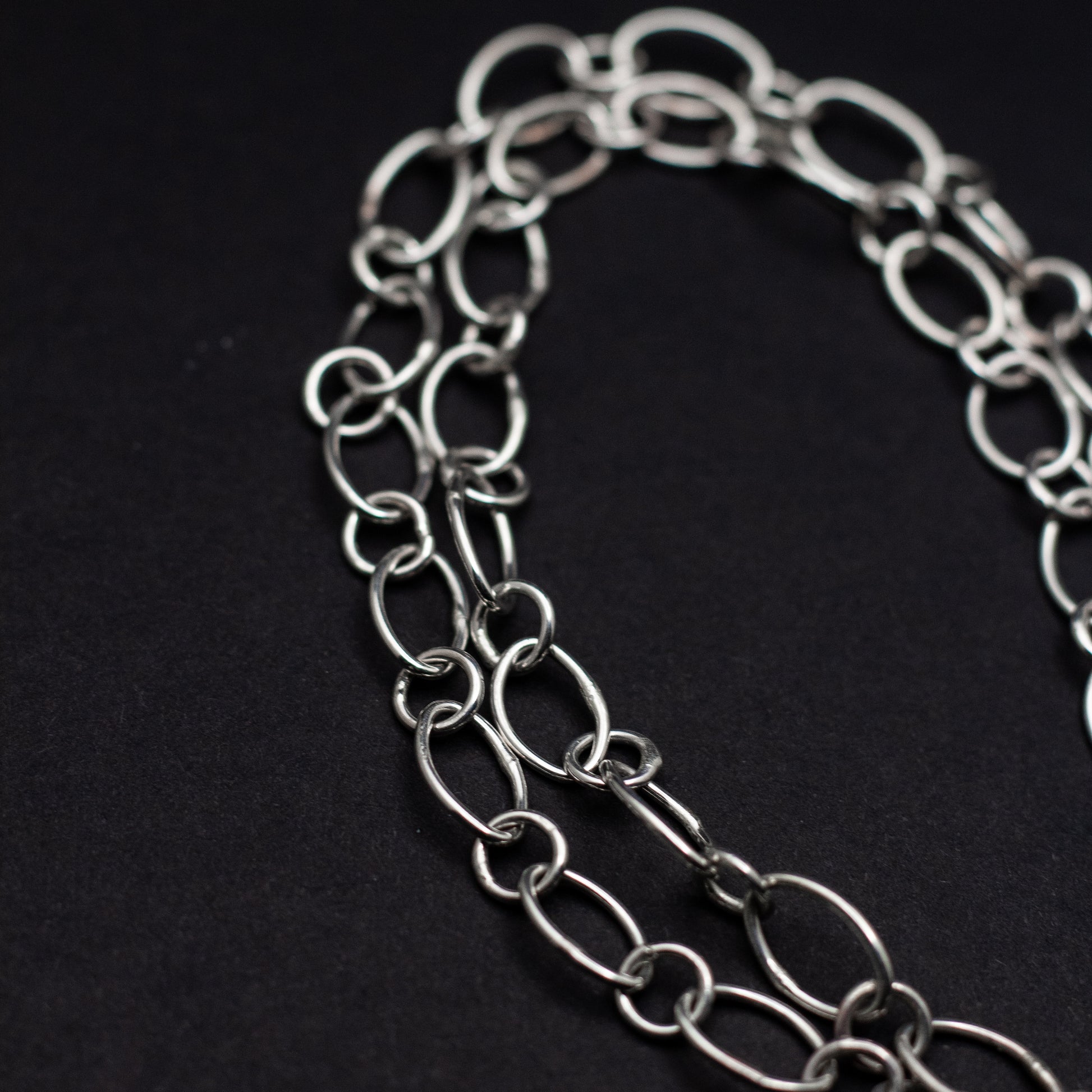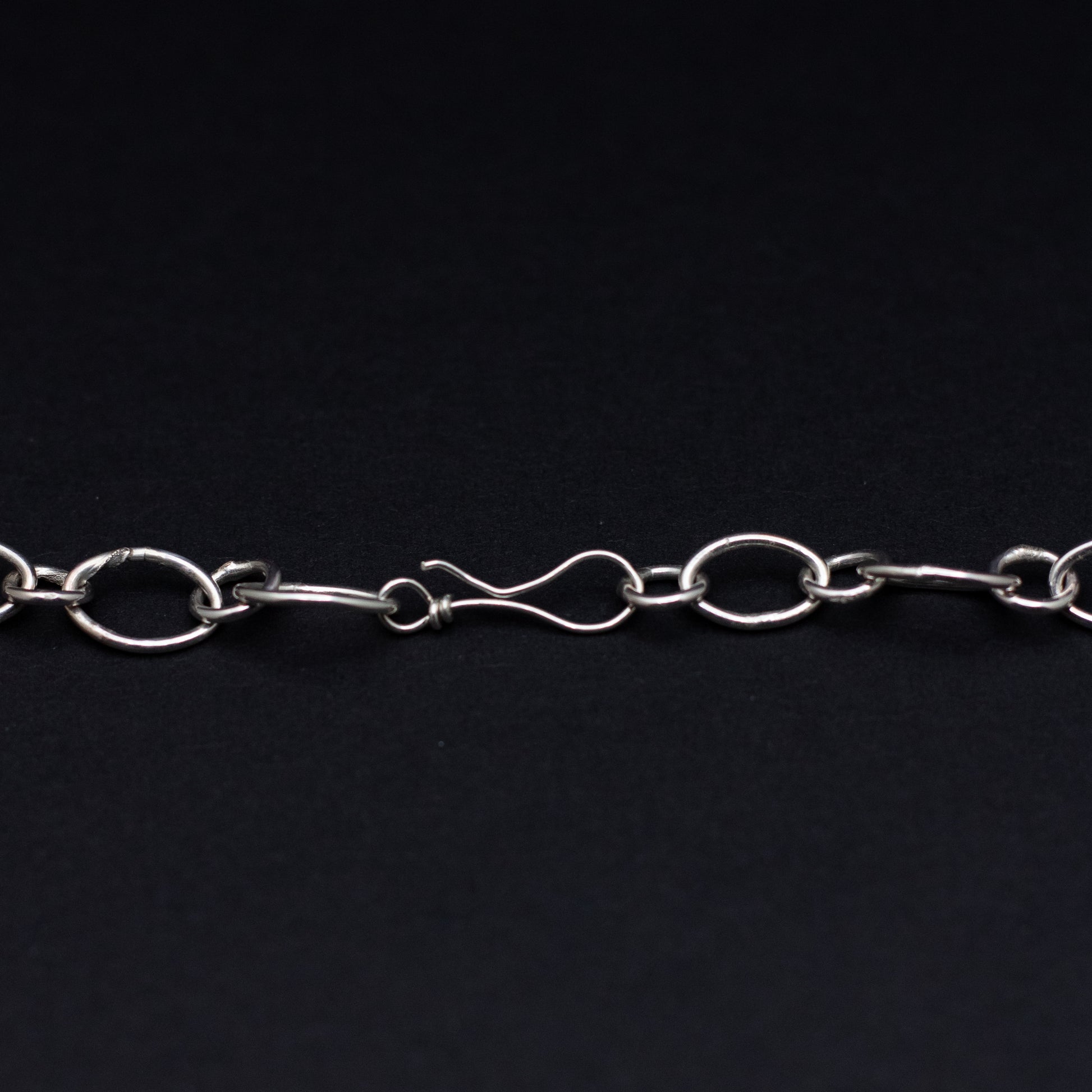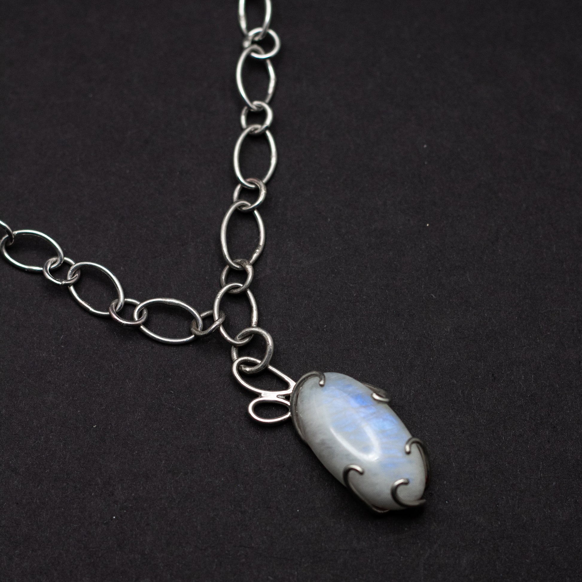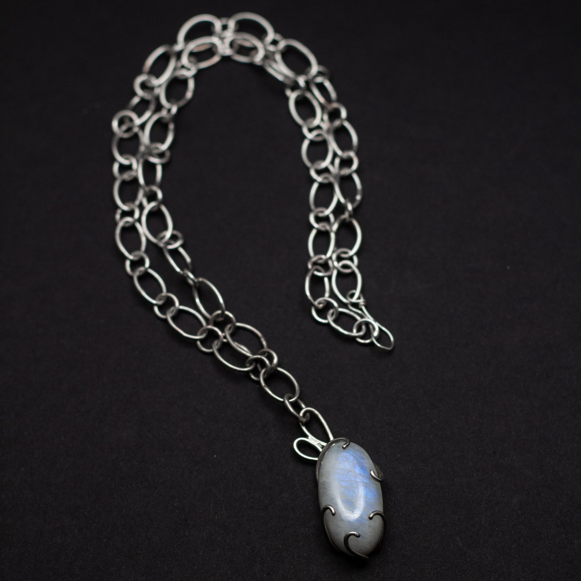 This one-of-a-kind blue moonstone necklace is entirely handcrafted in solid .925 sterling silver, from the pendant setting to the chain and clasp. Every component was individually fabricated and carefully soldered at each joint, creating a piece defined by precision, strength, and thoughtful construction. The luminous blue moonstone centerpiece measures approximately 1 inch in length, revealing soft flashes of blue as it catches the light, while the finished pendant hangs at 1.25 inches, offering an elegant, balanced presence when worn. The chain length rests at approximately 18 inches.