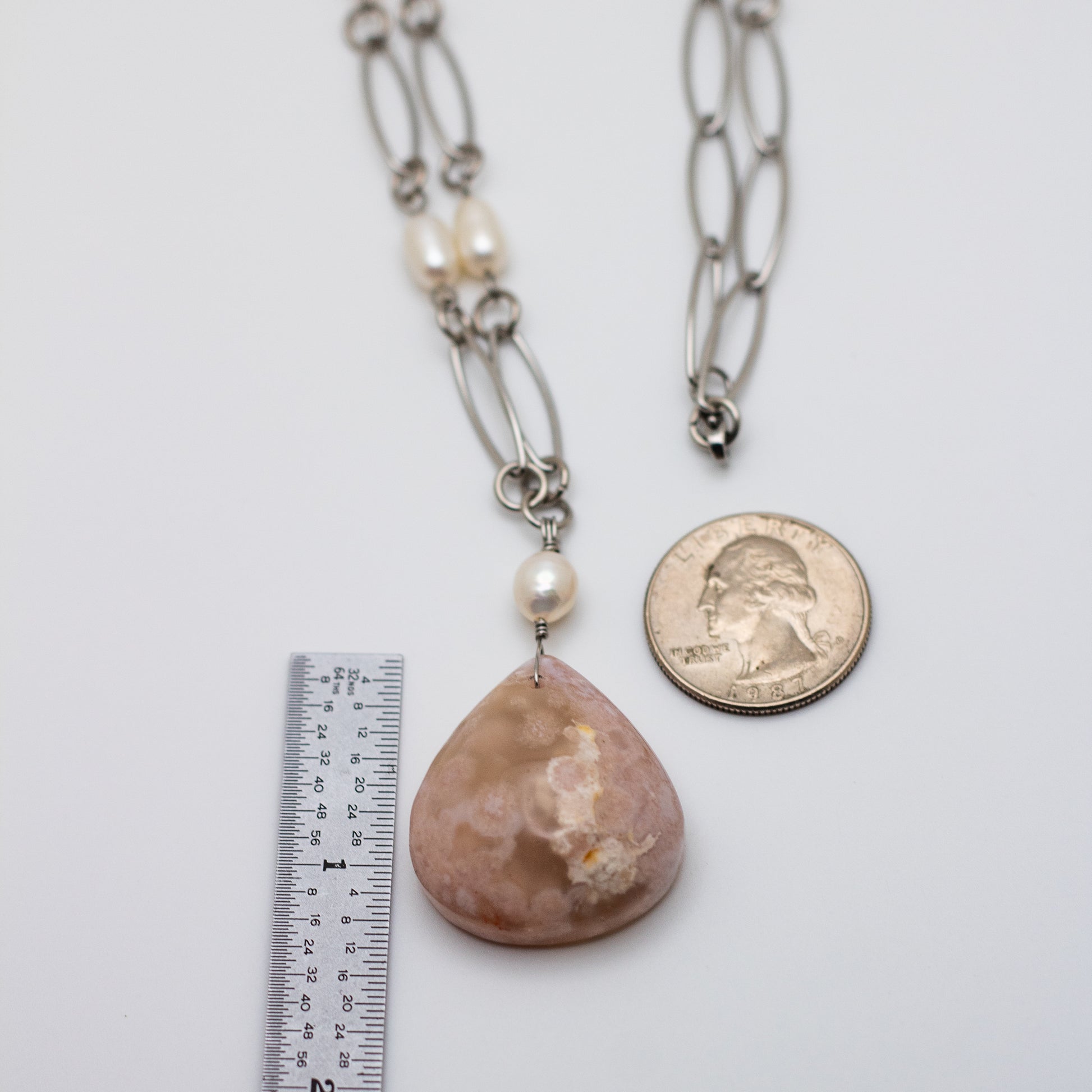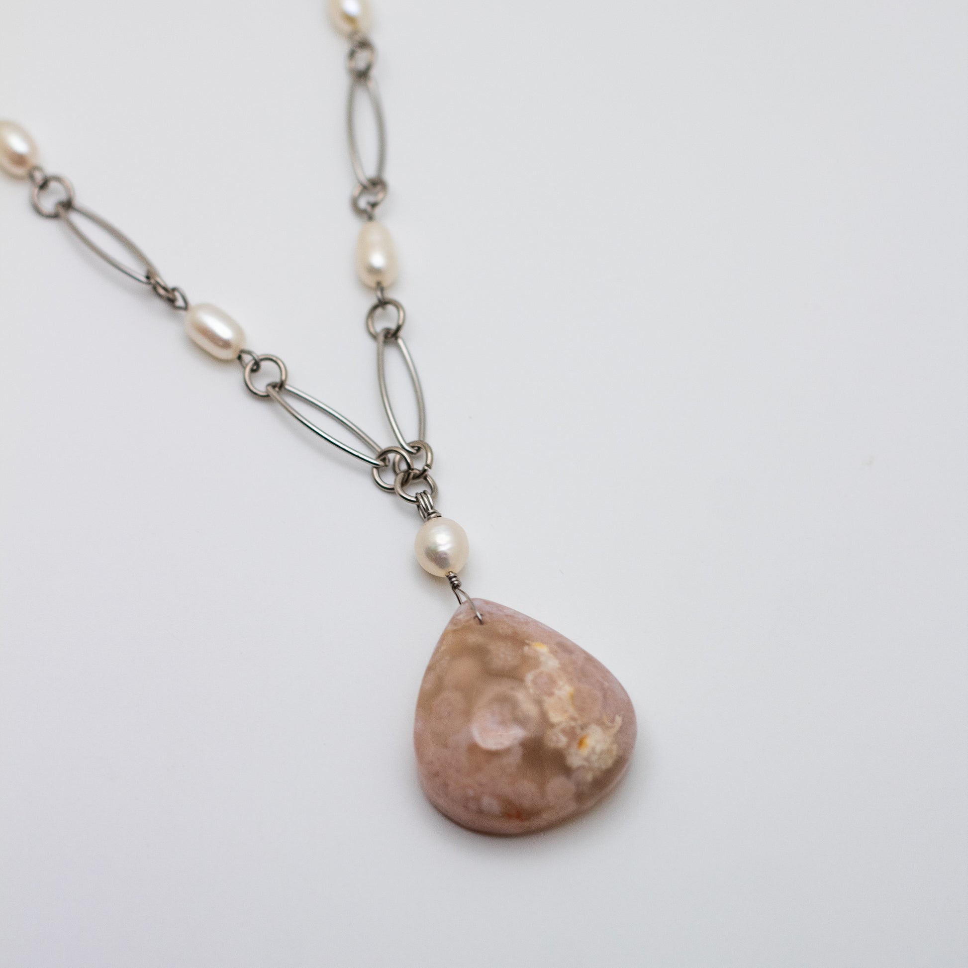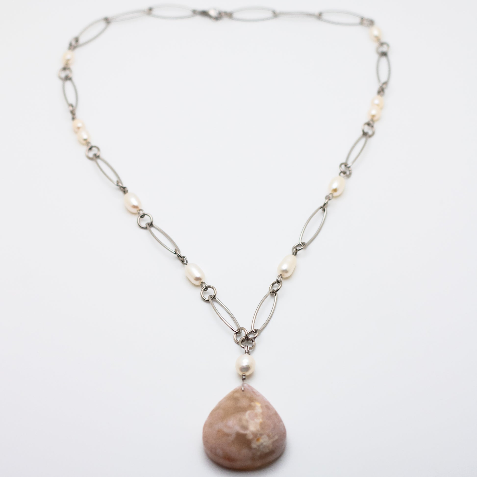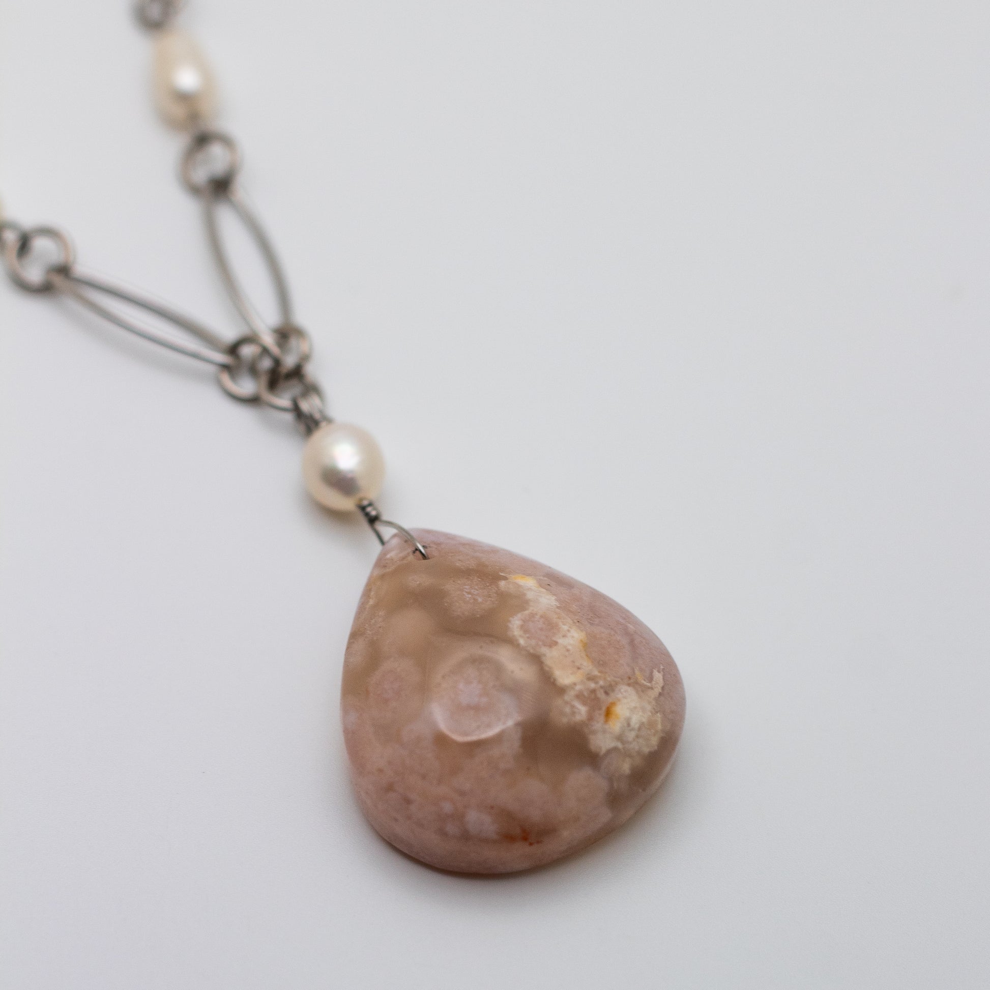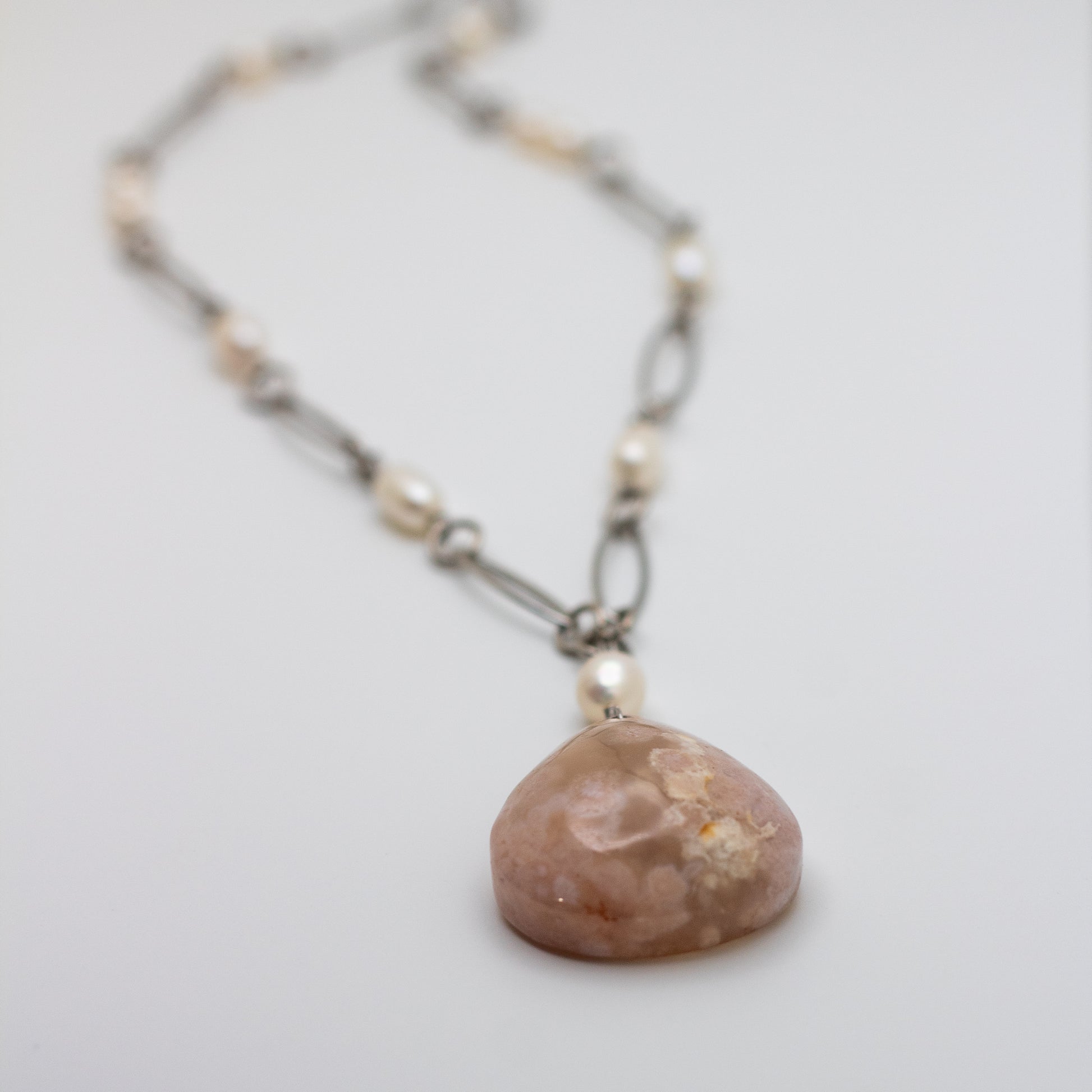 A piece of natural elegance and timeless beauty, this Cherry Blossom Agate & Freshwater Pearl Statement Necklace is a breathtaking fusion of earthy charm and classic sophistication. Featuring a 1.25" x 1.25" Cherry Blossom Agate pendant, complemented by delicately beaded freshwater pearls along an 18” long, elegant paperclip-style chain, this necklace is a true statement piece.