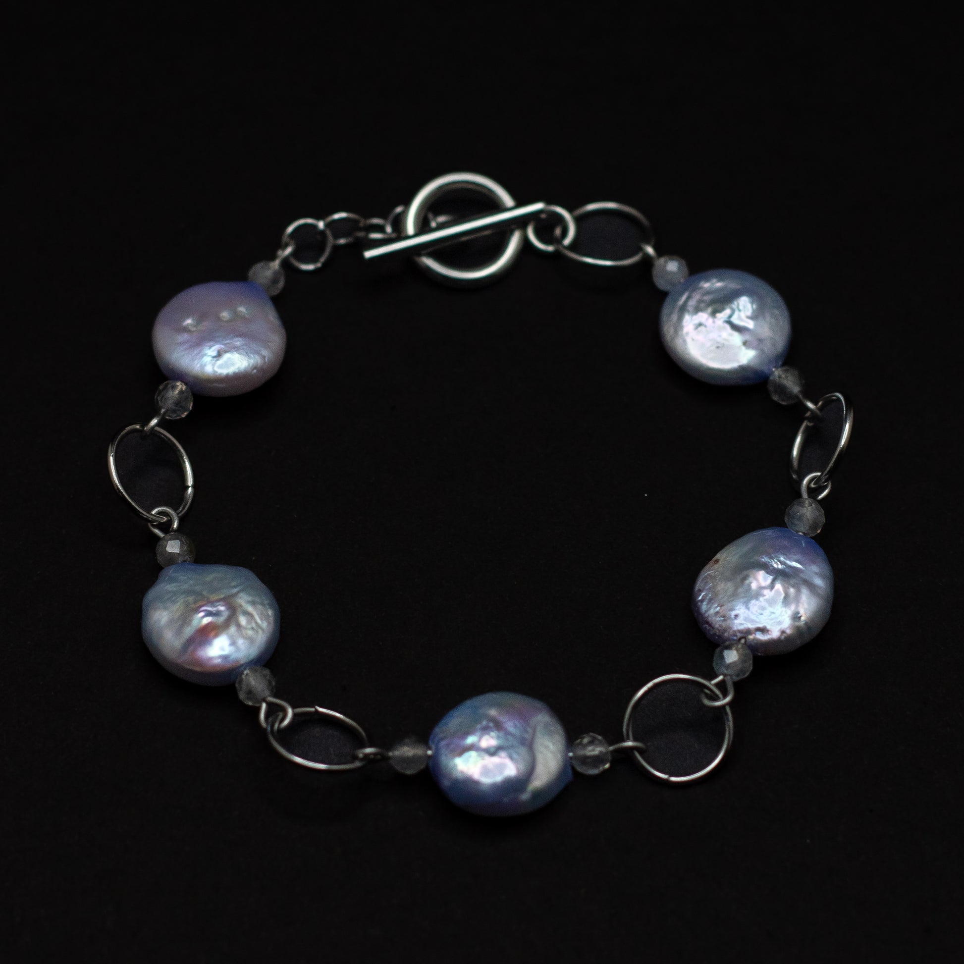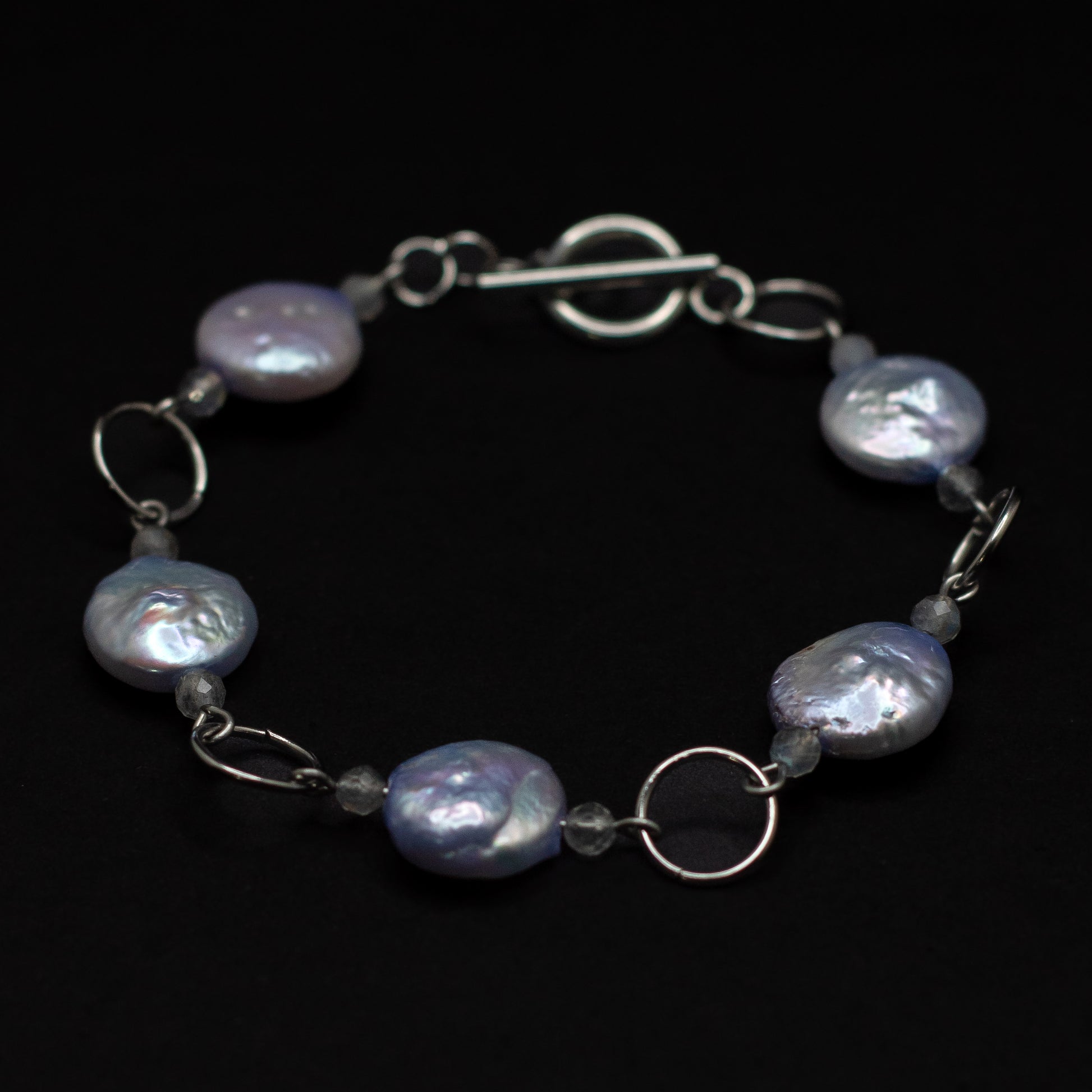 Elegant with a touch of edge, this stainless steel bracelet features luminous lavender coin freshwater pearls paired with micro-faceted labradorite beads for a subtle shimmer and rich depth. The combination of smooth, organic pearls and the natural sparkle of labradorite creates a timeless piece that’s easy to wear and endlessly versatile.