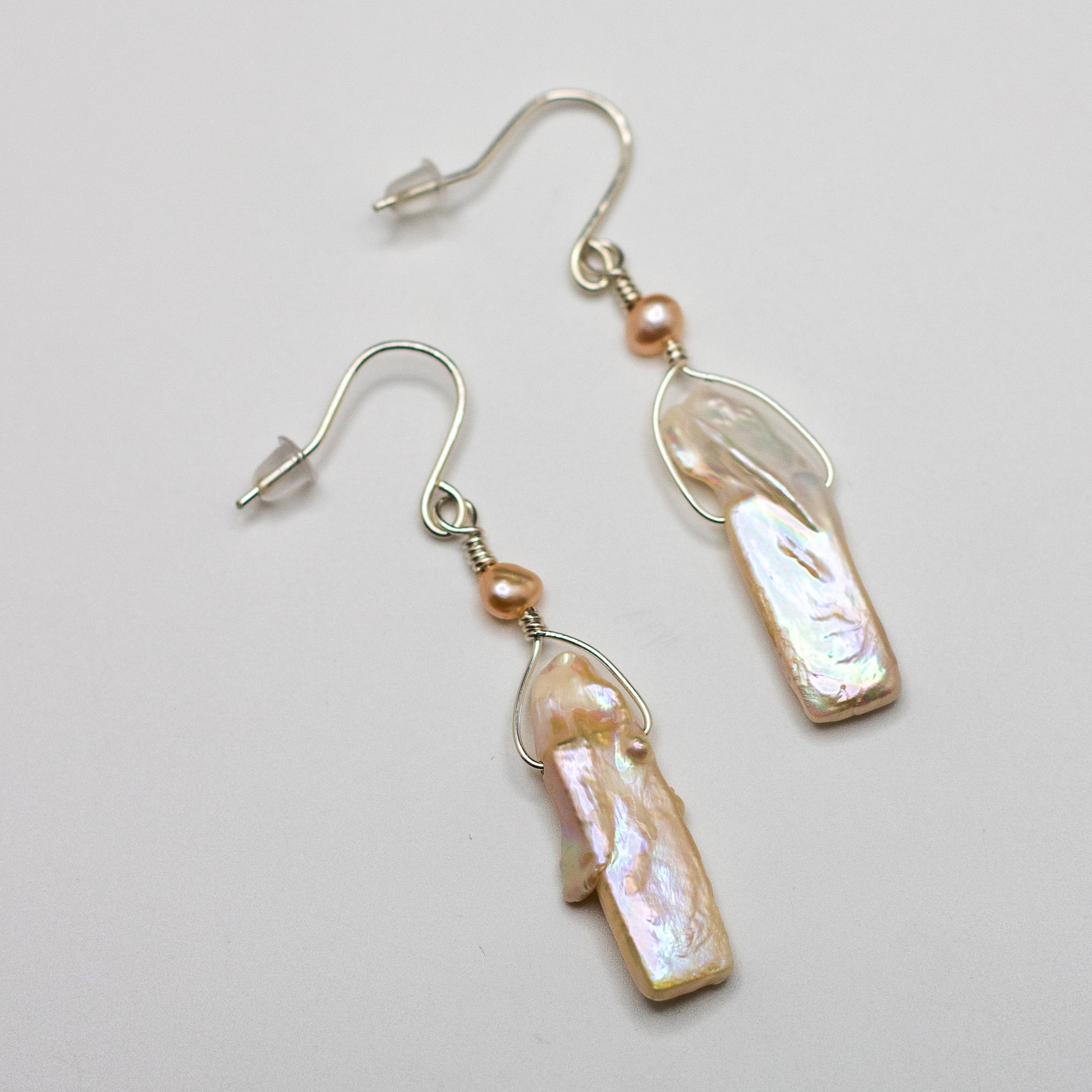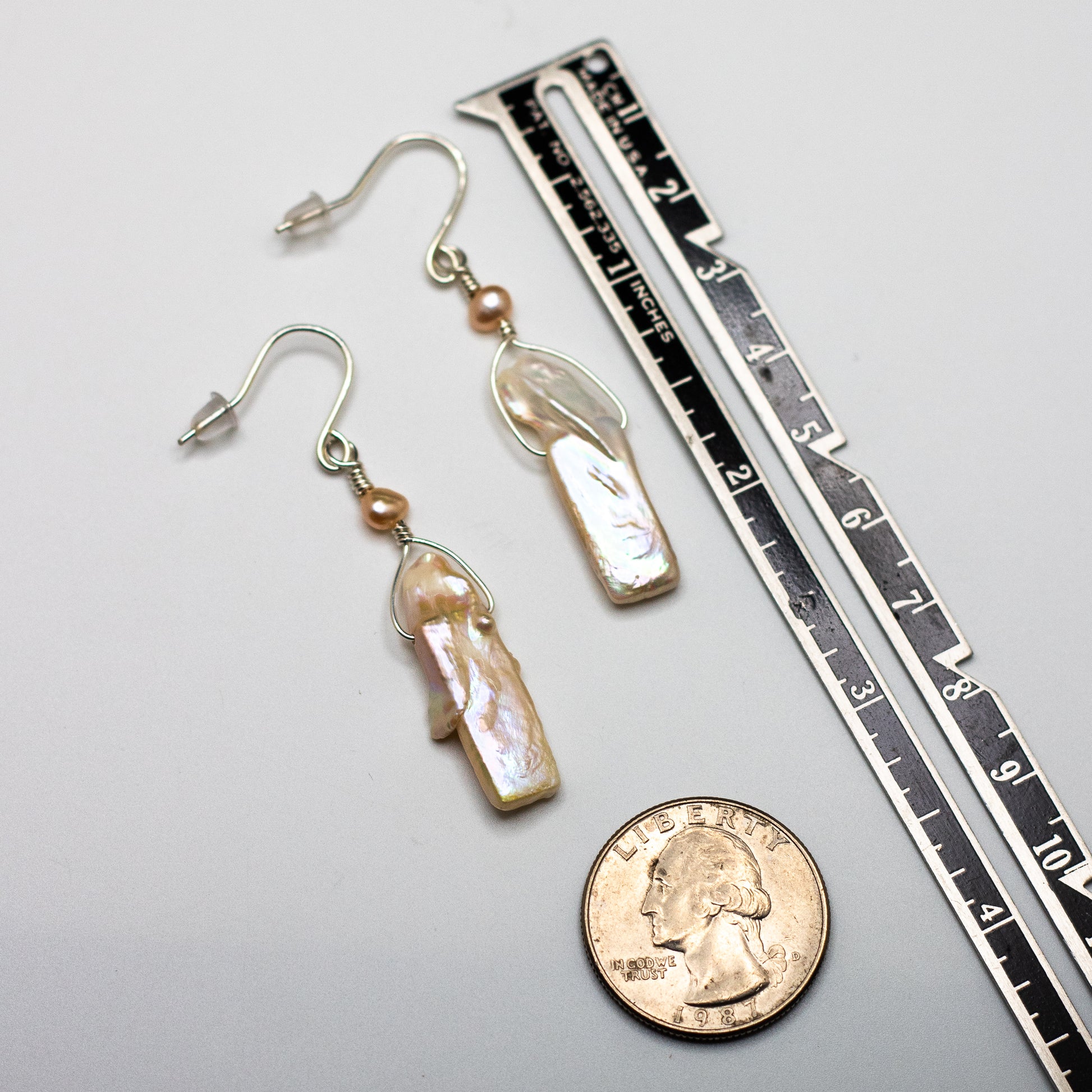 Elegant and effortlessly radiant, the Keshi Pearl Charm Earrings are a delicate statement of timeless beauty. Measuring 2.25 inches in length, each earring features a large, luminous Keshi pearl—known for its irregular shape, high luster, and organic charm—they are suspended by a petite but beautiful champagne pearls that pull out the warm tones of the focal pearls.