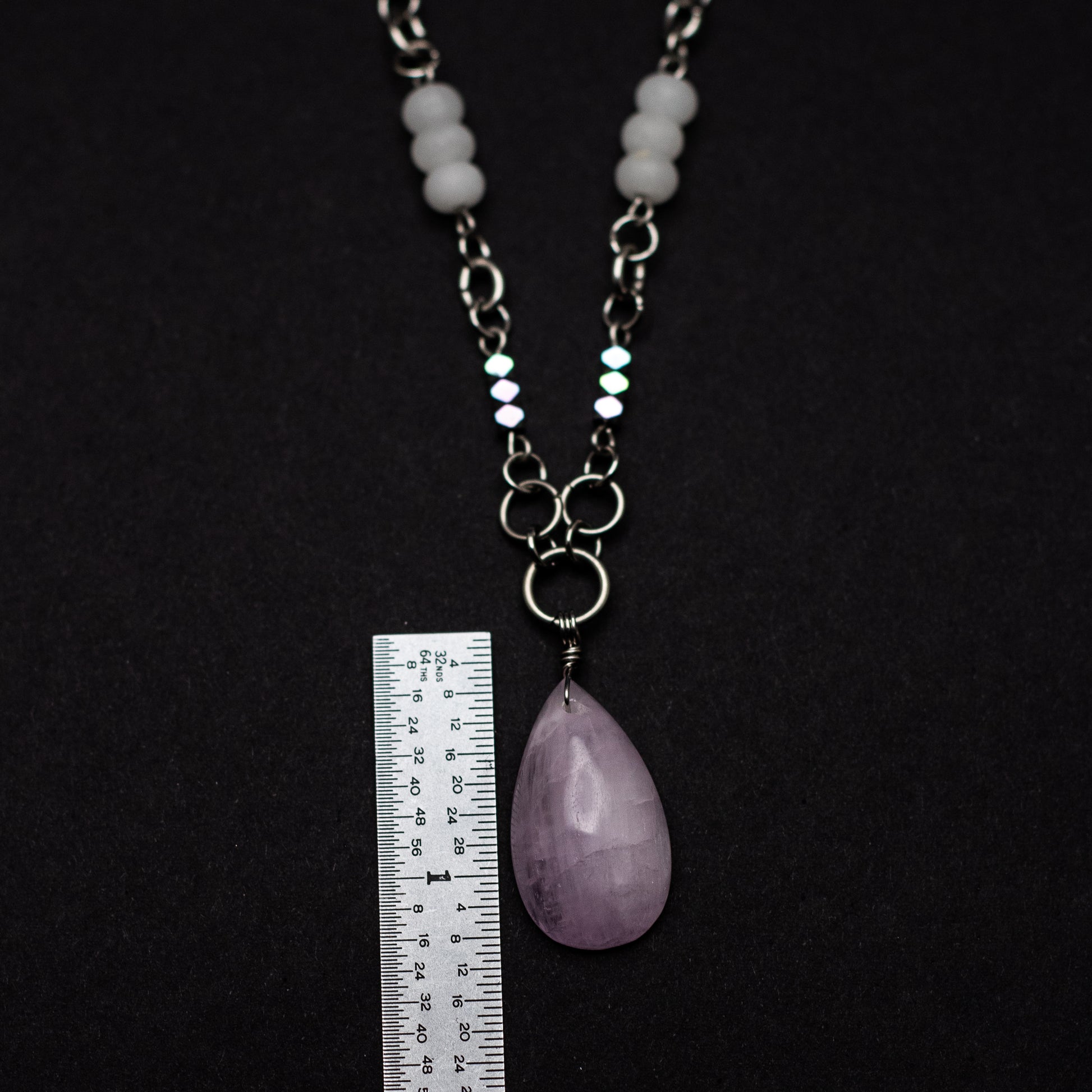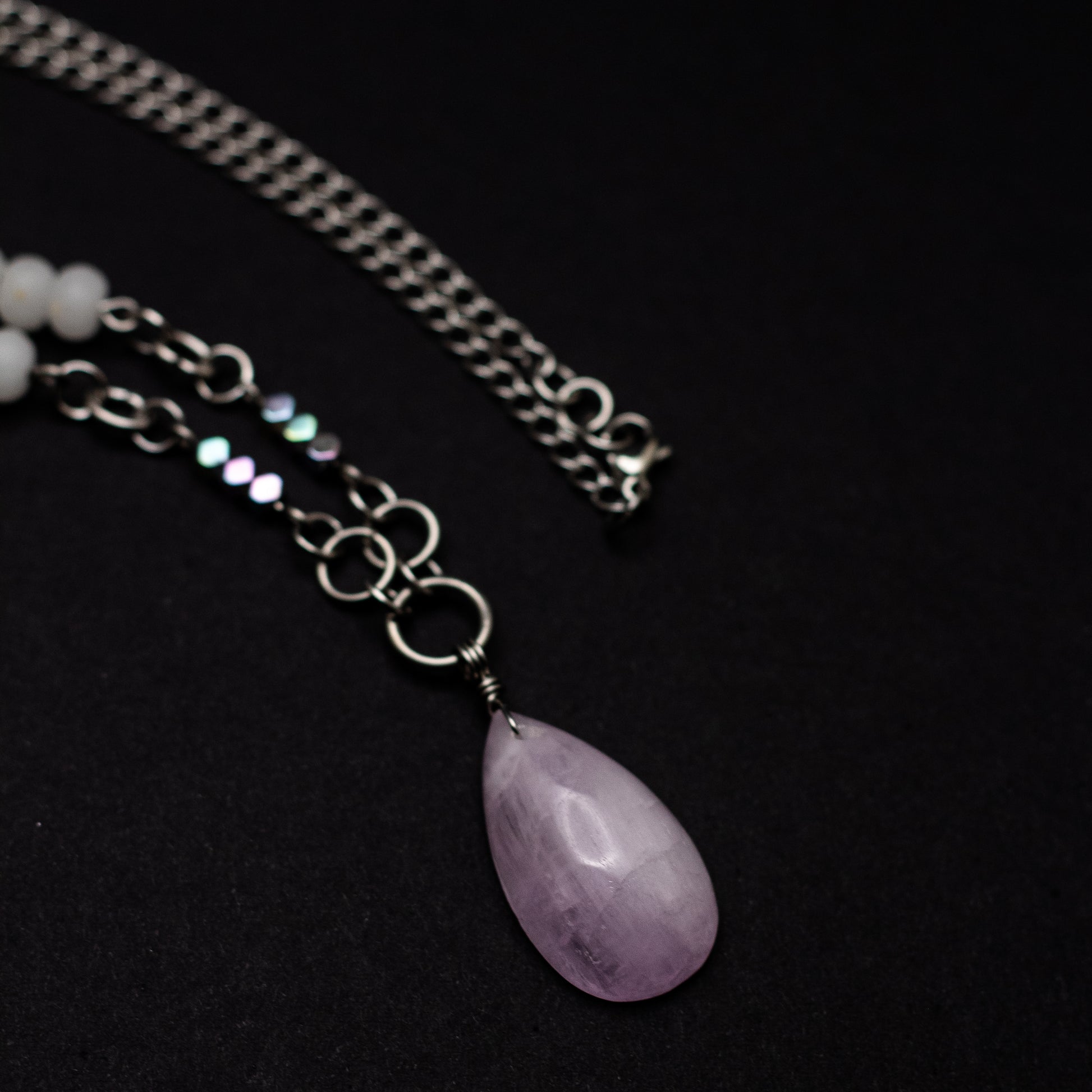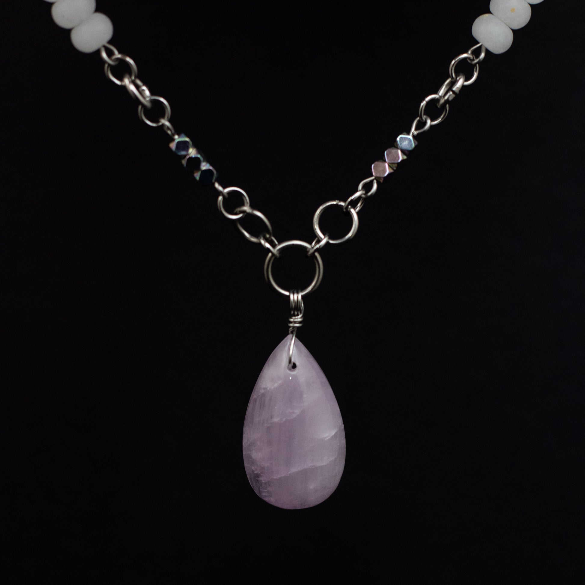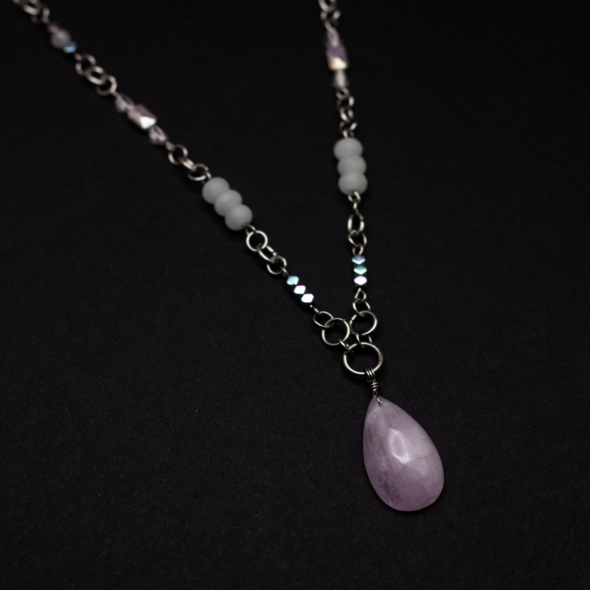 At its heart is a captivating kunzite teardrop pendant, measuring approximately 1" long by 0.5" wide, radiating with natural lavender tones known for encouraging emotional openness and inner peace. The 18" stainless steel chain is adorned with a thoughtful arrangement of white jade, rainbow hematite, rose quartz, and Czech glass—each chosen for its harmony of hue and meaning.