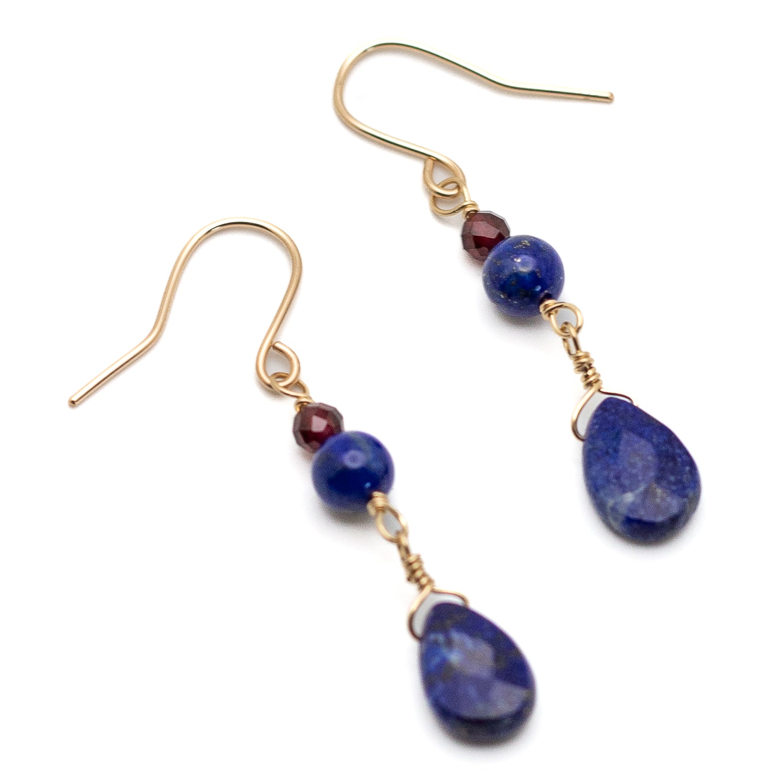 A bold and timeless pairing, these 14K gold filled earrings feature deep blue lapis lazuli teardrops and rounds, beautifully accented by micro-faceted garnet beads for a rich, striking contrast. Each element is thoughtfully arranged to highlight the natural beauty and depth of these classic stones.