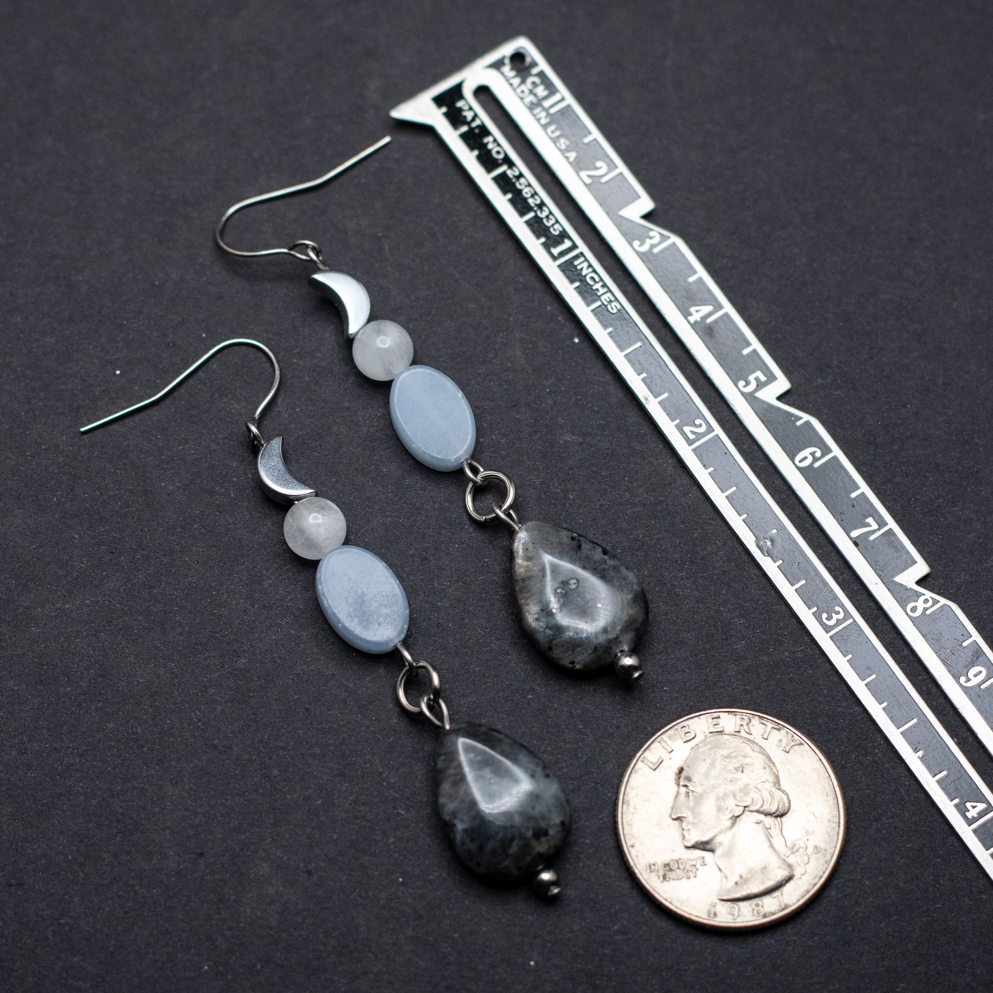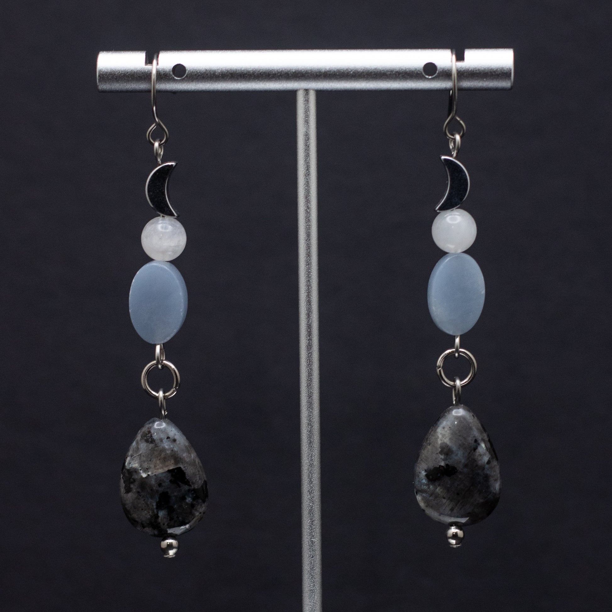 Larvikite, Angelite, Blue Moonstone & Hematite Moon Earrings