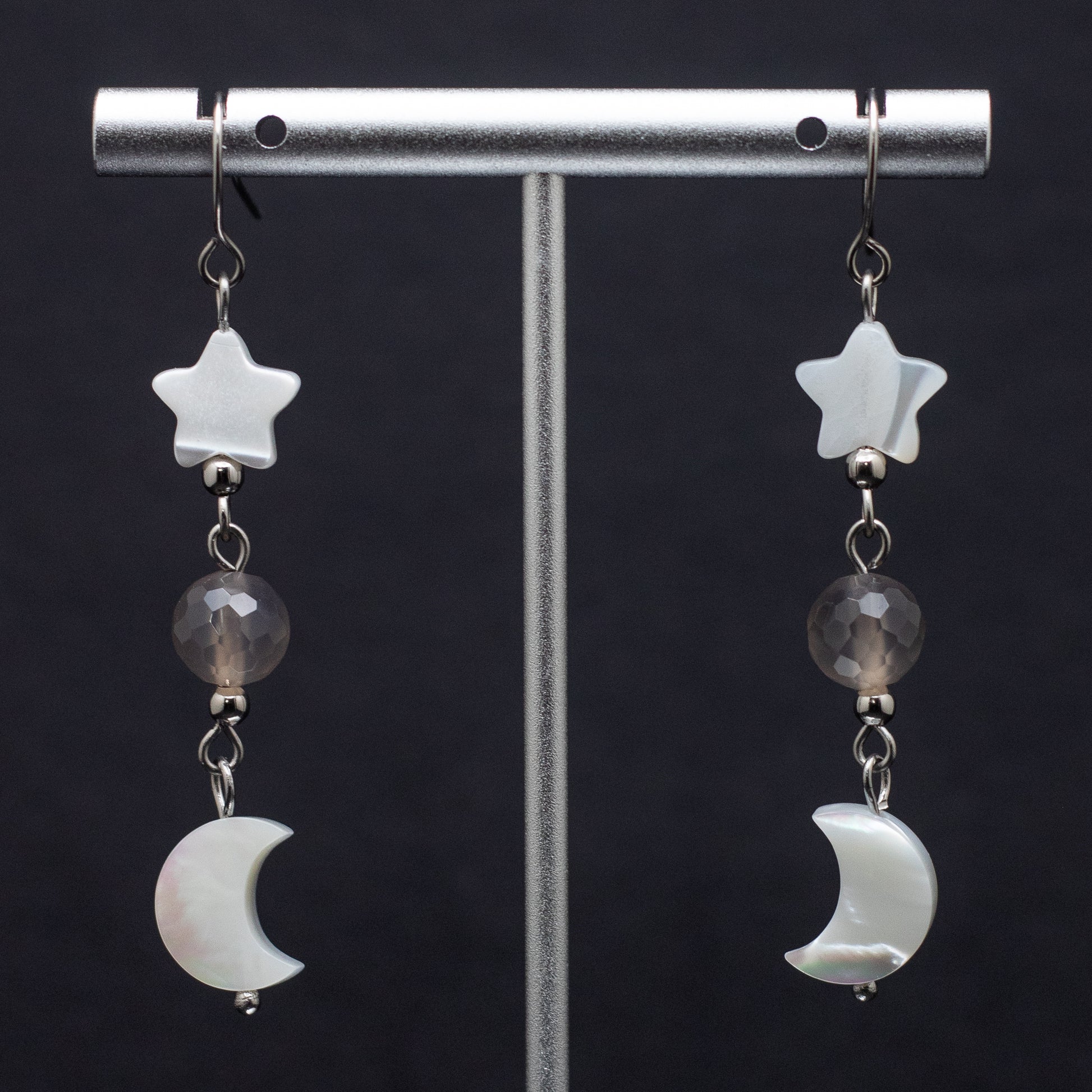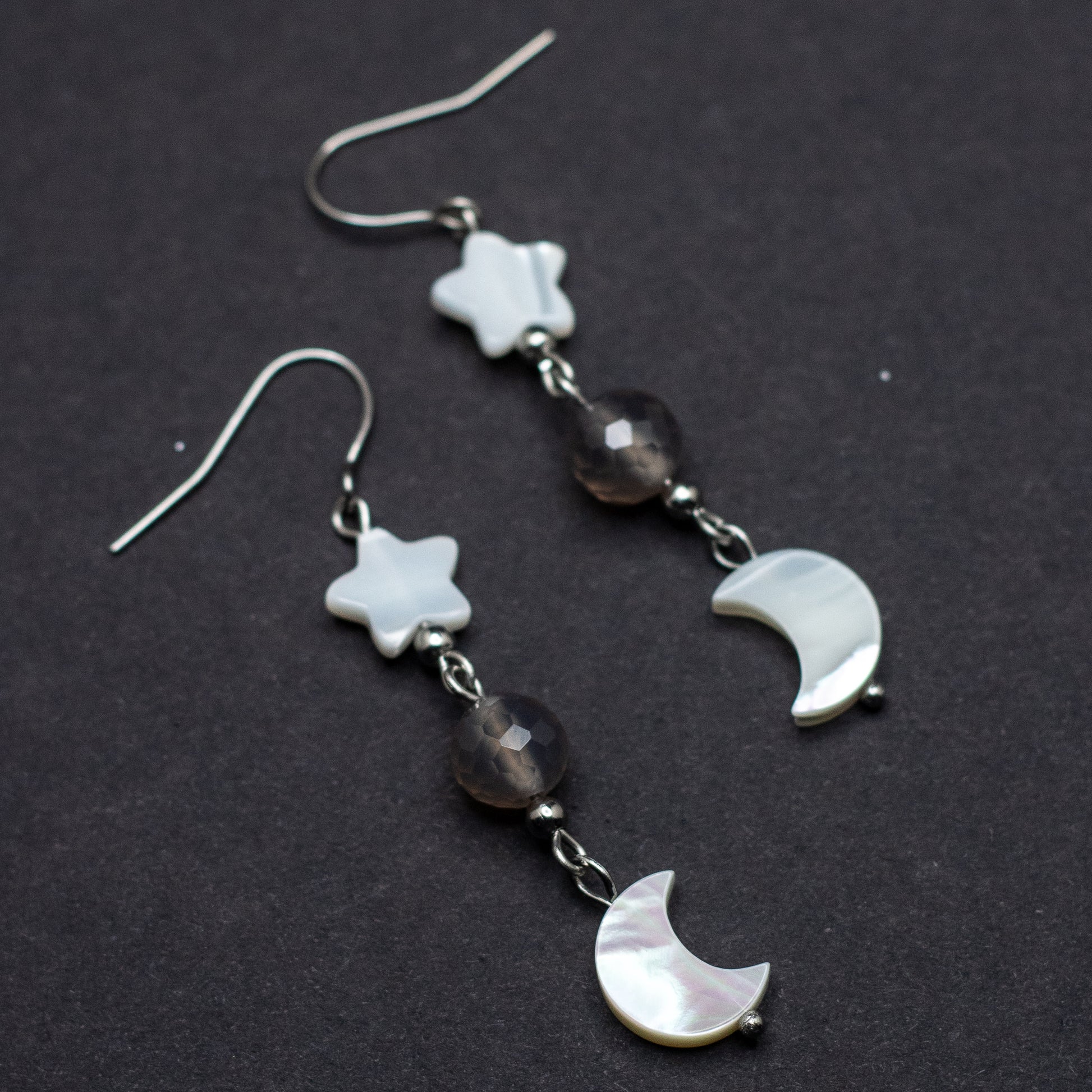 Mother of Pearl Moon & Star Earrings with Faceted Gray Agate