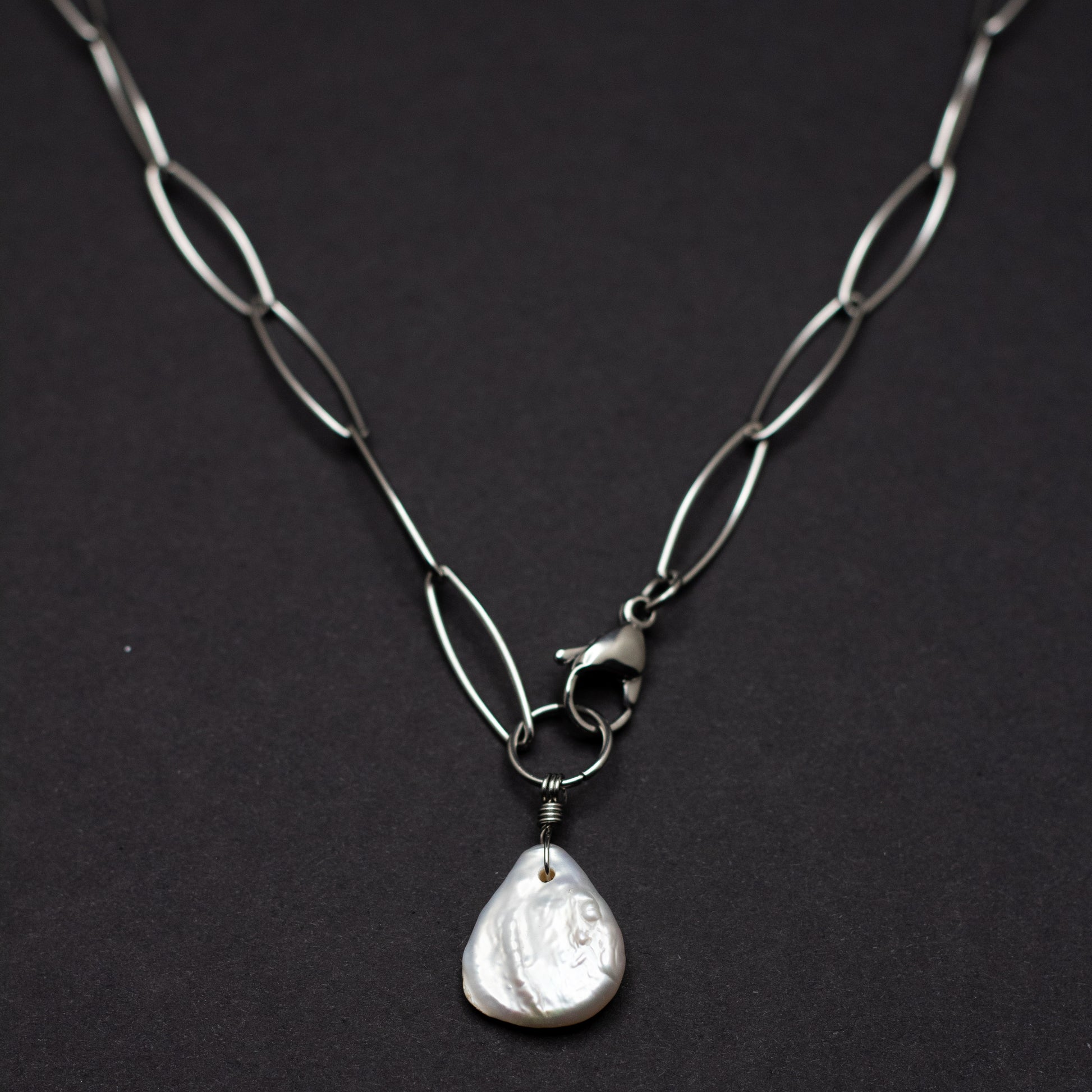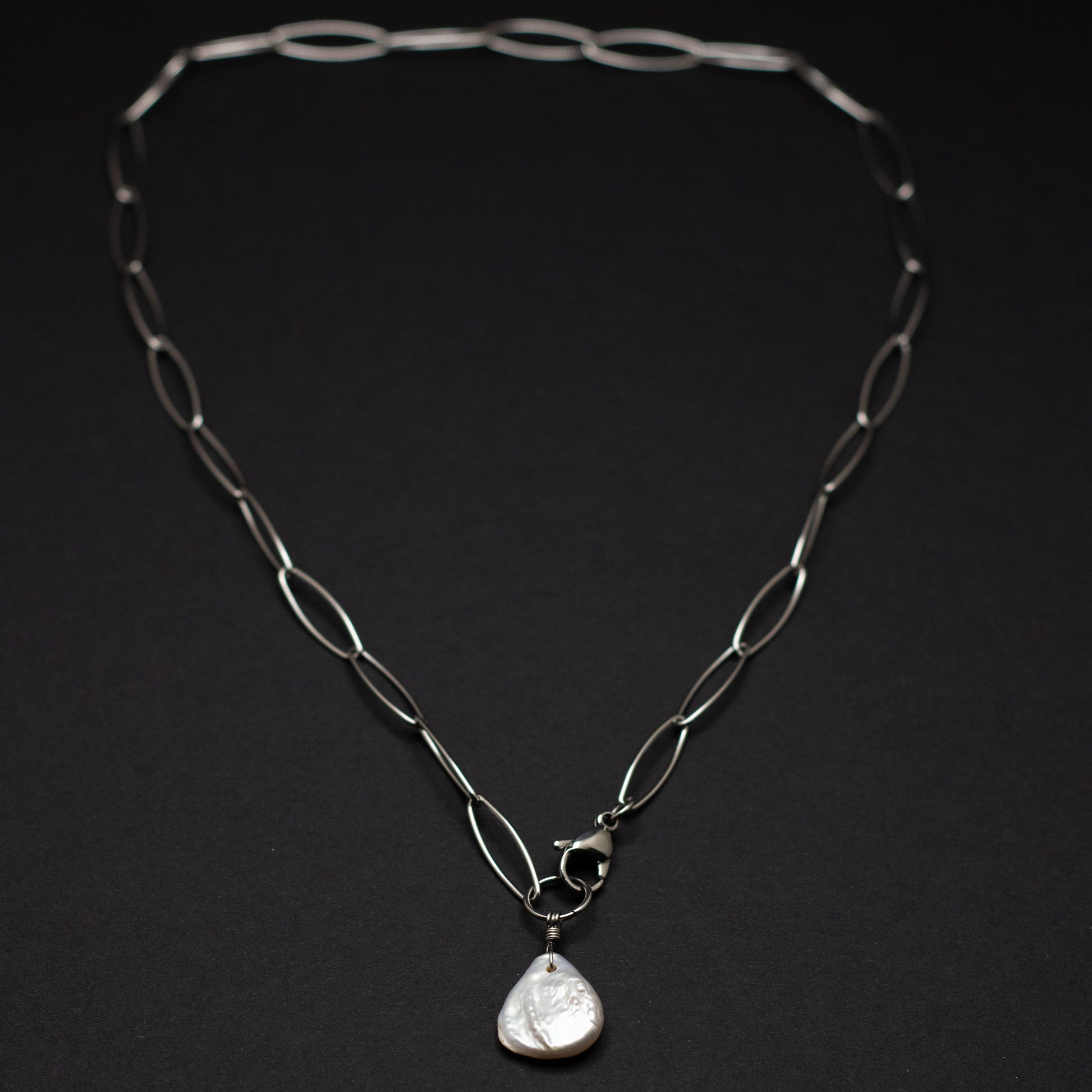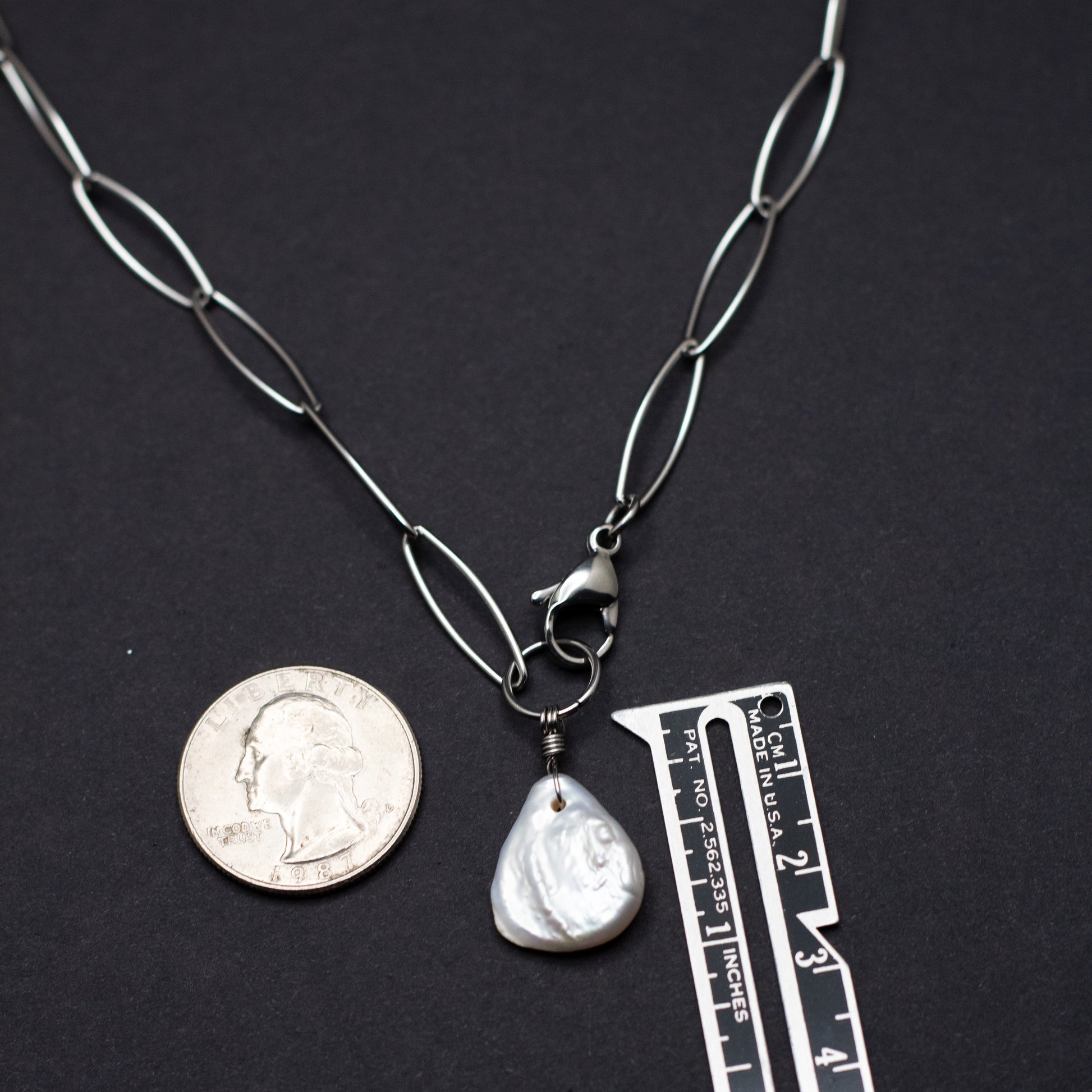 Timeless elegance meets everyday wearability in this handcrafted pearl necklace. At its center hangs a lustrous 1-inch teardrop freshwater pearl, known for its natural sheen and graceful form. The pearl is suspended from an 18-inch rounded oval paperclip chain, offering a modern yet classic look.