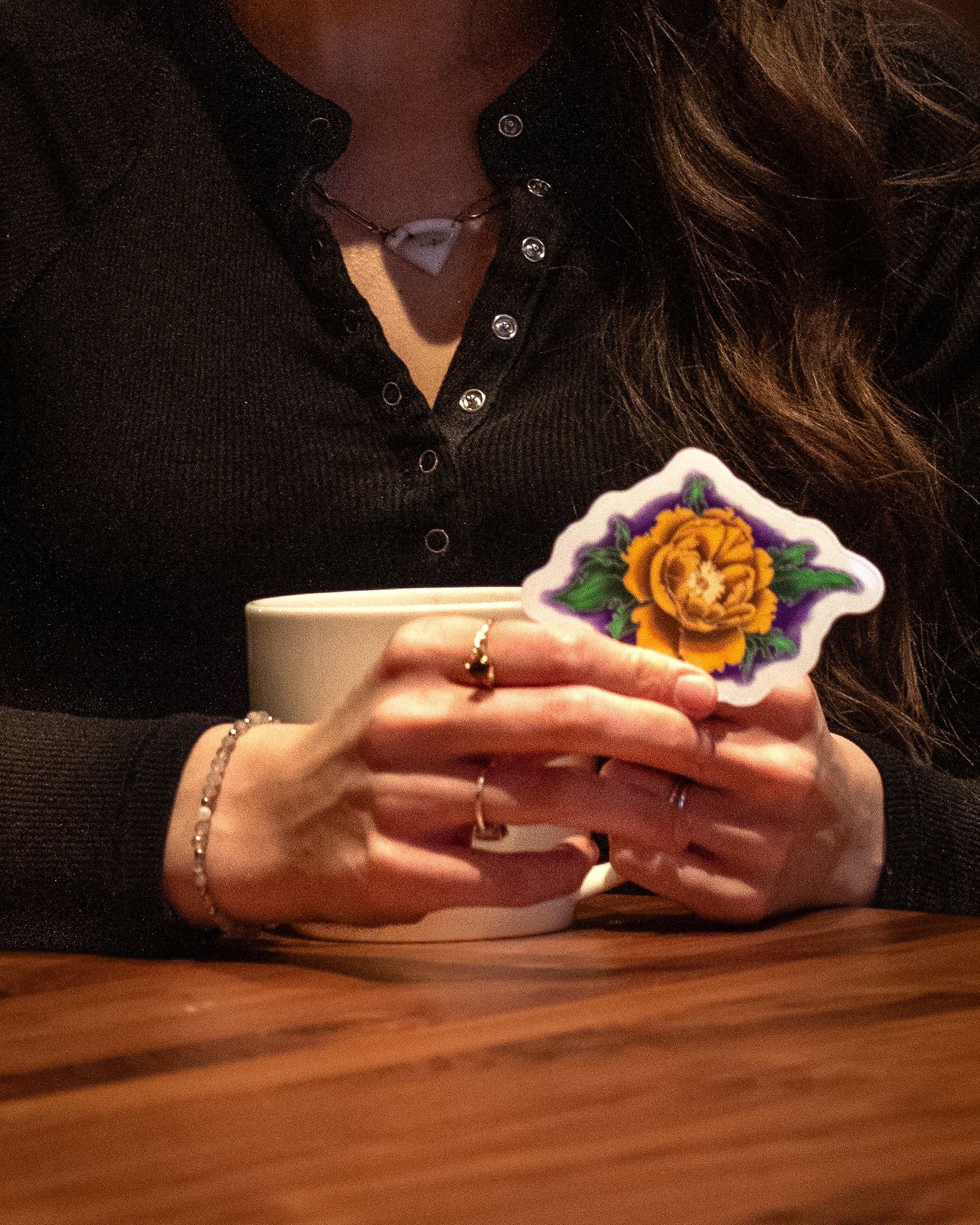 Created in honor of National Eating Disorder Awareness Month, this meaningful bundle pairs art and adornment as symbols of resilience, healing, and self-trust. The set includes a 3x3” vinyl sticker featuring an original digital illustration of an orange peony—a flower often associated with strength, compassion, and courageous growth—alongside a microfaceted labradorite gemstone bracelet.