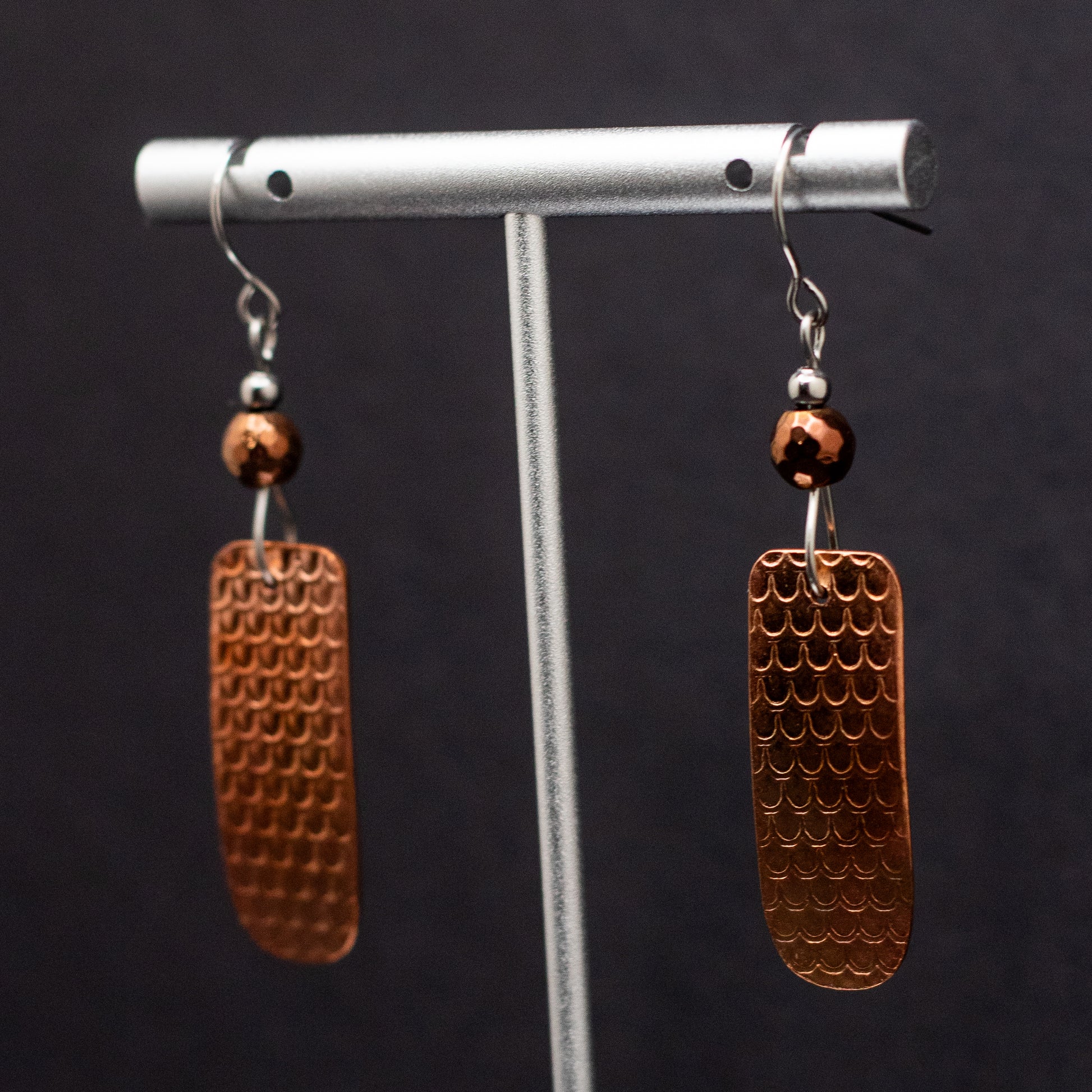 Each pair was created through a meticulous, hands-on process—hand rolling the scallop texture, carefully sawing, filing, shaping, and annealing the copper, then tumbling, finishing, and polishing to bring out its natural glow. The result is a piece of jewelry with character, detail, and a story in every curve.